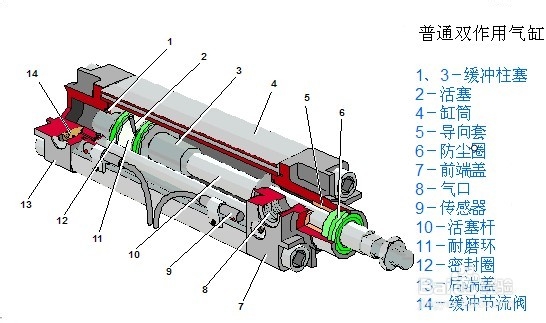 以氣動系統(tǒng)中常使用的單活塞桿雙作用氣缸為例來說明,氣缸典型結構如下圖所示。它由缸筒、活塞、活塞桿、前端蓋、后端蓋及密封件等組成。雙作用氣缸內部被活塞分成兩個腔。有活塞桿腔稱為有桿腔,無活塞桿腔稱為無桿腔。